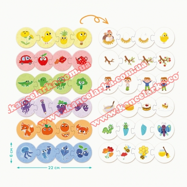 Возраст: от 18 месяцев Комплектация одного пазла: 6 двусторонних пазлов на 4 элемента и 10 карточек с заданиями Размер собранного пазла: примерно 6x22 см Размер коробки: d9,5 * 14 см.