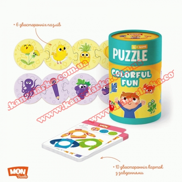 Комплектация одного пазла: 6 двусторонних пазлов на 4 элемента и 10 карточек с заданиями