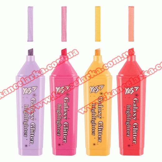 Маркери з глітером YES Galaxy Glitter – це високоякісні маркери чотирьох пастельних відтінків, які підійдуть для виділення корисної інформації у конспектах, оформлення розворотів блокнотів.