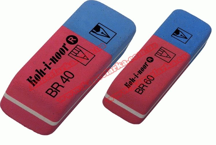 Комбінована гумка з натурального каучука для широкого використання: червона сторона найкращим способом видаляє слід графітних олівців твердості 8В-10Н, а синя -слід чорнила, туші, друкарських машин.
