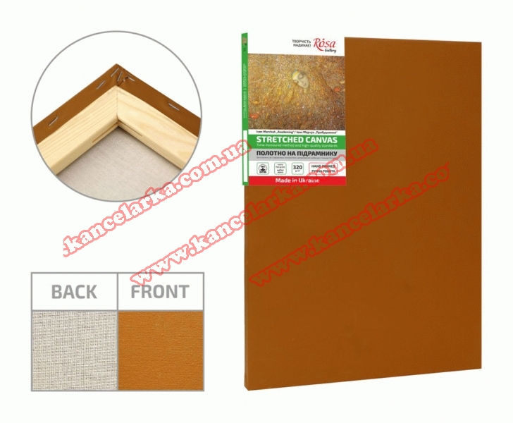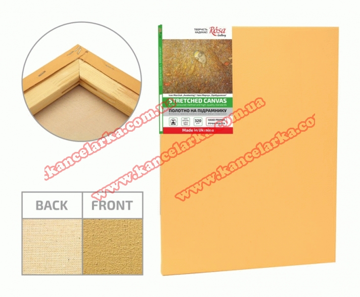Полотно: 100% бавовна Зернистість: дрібне зерно (220г/м2) Проклейка: високоякісний желатин, три шари Грунт: акриловий, три шари Модуль: клеєна сосна Упаковка: захисна плівка