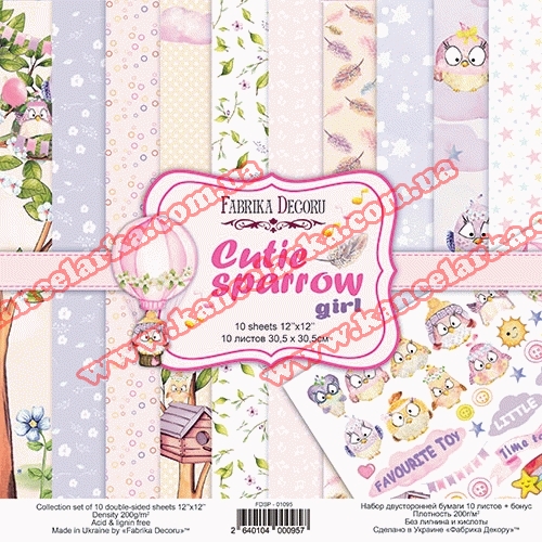 «Cutie sparrow girl» - дитячий папір для скрапбукінгу. Цей набір поєднує в собі фонові листи в горошок, квіточку і нотки, а так само забавні сюжети про пригоди пташки. Головна героїня колекції «Cutie sparrow girl» маленька пташка, вона вчиться літати, стрибає з гілки на гілку і подорожує на повітряній кулі. Лист скраппаперу з пір'їнками і хмарами підкреслює загальну тематику колекції.