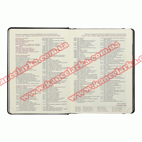 Датована сторінка на кожен день року з організатором часу від 7:00 до 21:00, календарем на поточний/наступний місяць, позначенням дня тижня, знаку зодіаку, іменинників