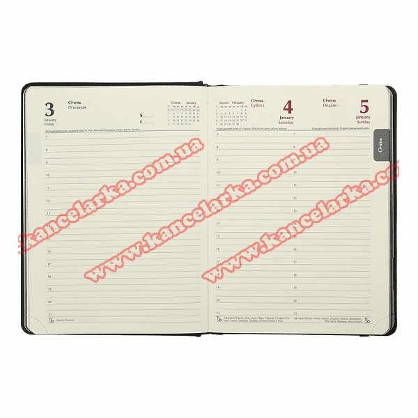Датована сторінка на кожен день року з організатором часу від 7:00 до 21:00, календарем на поточний/наступний місяць, позначенням дня тижня, знаку зодіаку, іменинників