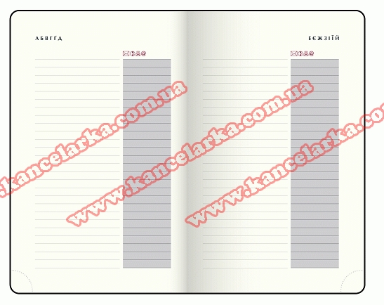 Датована сторінка на кожен день року з організатором часу від 7:00 до 21:00, календарем на поточний/наступний місяць, позначенням дня тижня, знаку зодіаку, іменинників